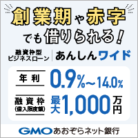 GMOあおぞらネット銀行は実質年率0.9%~14.0%の業界最安水準の年率で借りられる、融資型ビジネスローンとなります!創業期や赤字でも借入可能なことや、申し込みから融資まで最短2営業日とスピード感が抜群となります。